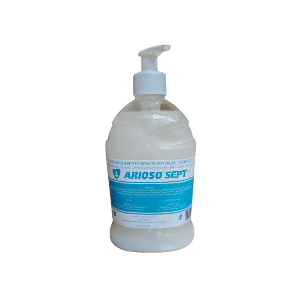 Tekuté mýdlo ARIOSO SEPT pro hygienické mytí pokožky rukou s antimikrobiálním účinkem v praktickém balení s dávkovačem. Mýdlo je vhodné pro každodenní použití, obsahuje rostlinné složky z hřebíčku a zeleného čaje, které mýdlu propůjčují příjemnou vůni (aroma neovlivňuje charakter potravinářských výrobků). Komplex dermálních látek a nulová zbytková alkalita umožňují časté používání bez nebezpečí poškození pokožky. Bez barviv a obsahu parfémové složky.