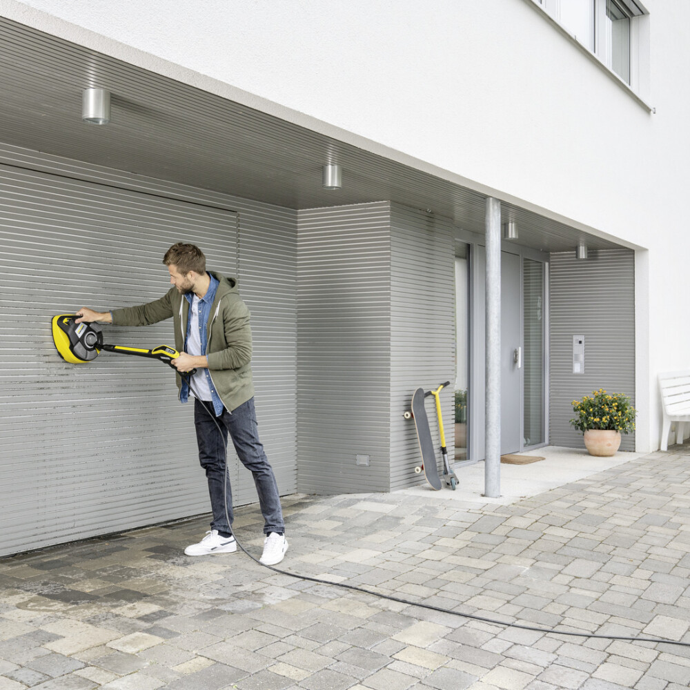 Čistič ploch T 7 Plus je účinným nástrojem pro čištění vnějších ploch bez zpětného stříkání. Otočné rameno s dvojitým paprskem odstraňuje nečistoty z velkých ploch, což šetří cca. 50% vašeho času ve srovnání s čištěním pomocí stříkací trubice. Přidání výkonové trysky také zaručuje účinné čištění v rozích a na okrajích. Díky integrované oplachovací trysce se uvolněné nečistoty jednoduše zbaví vyčištěného povrchu - ušetří se tak čas a úsilí. Tvrdé plochy, jako je kámen a beton, a jemnější plochy, jako je dřevo, lze vyčistit úpravou vzdálenosti mezi tryskou a povrchem, který má být čištěn. Díky vznášedlovému efektu je čistič ploch velmi snadno ovladatelný. Různé funkce se volí jednoduše pomocí nožního spínače. Díky svému praktickému držadlu lze pomocí blesku vyčistit i svislé plochy, jako jsou garážová vrata. Vhodné pro tlakové myčky v rozsahu K4 až K7.