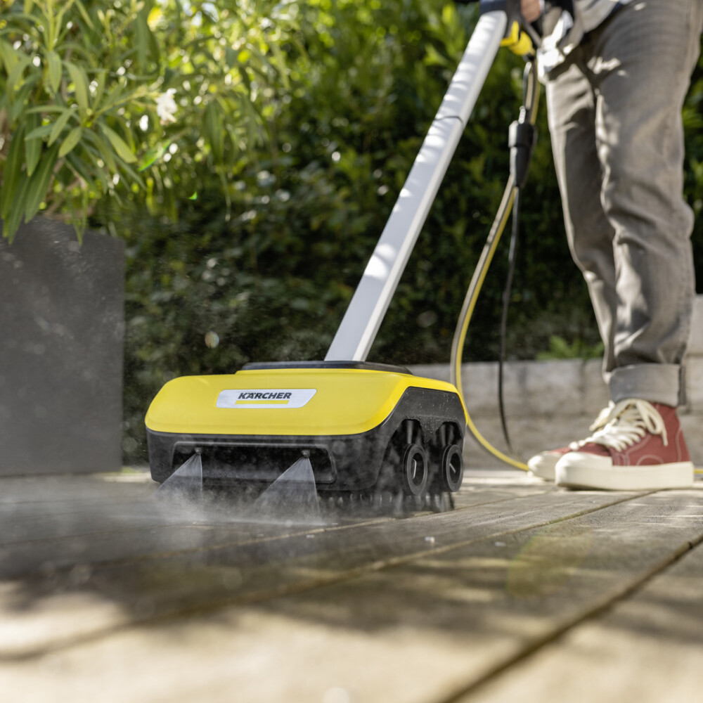 Elektricky poháněný čistič teras PCL 6 lze použít k mimořádně snadnému, rovnoměrnému, rychlému a důkladnému odstranění odolných nečistot. Zařízení stačí připojit k zahradní hadici - a můžete začít čistit. Díky kombinaci čtyř rotujících válečkových kartáčů a nastavitelného přívodu vody lze nečistoty rychle a spolehlivě smáčet a zároveň je sbírat a odnášet. Terasa je důkladně vyčištěna téměř během okamžiku, a to pouze za použití minimálního množství vody, které je potřeba. Šířka a poloha válců jsou navrženy tak, aby bylo možné v jednom kroku vyčistit dvě řady až po okraj, což rovněž šetří čas. Díky vyměnitelným kartáčům válečků lze snadno čistit nejen dřevěné a WPC podlahové krytiny, ale také hladké a jemně pórovité kamenné dlaždice a desky, a dosáhnout tak dokonalých výsledků.
