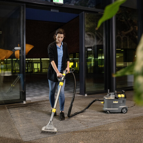 Profesionální sprejový extrakční čistič Puzzi 8/1 Adv od společnosti Kärcher poskytuje díky vynikajícímu výkonu zpětného sání skvělé a hygienické výsledky čištění a také rychlé opětovné použití textilních povrchů. Za tímto účelem sprejový extrakční čistič nastříká čisticí roztok hluboko do textilních vláken a poté jej opět odstraní s uvolněnou špínou, takže je ideální pro čištění čalounění, koberců a dalších textilních povrchů. Jeho robustní, kompaktní konstrukce zajišťuje dlouhou životnost a tím i vysokou hospodárnost – ideální pro dodavatele stavebních služeb, hotelový a pohostinský sektor nebo pro čištění interiérů vozidel. Víko spotřebiče, hubice na čalounění a podlahová hubice jsou průhledné pro lepší výhled na špinavou vodu. Nízká hmotnost Puzzi 8/1 Adv a ergonomická rukojeť umožňují přenášení jednou rukou. Pohodlí pro uživatele zvyšují také velká tlačítka, která lze ovládat rukou nebo nohou.