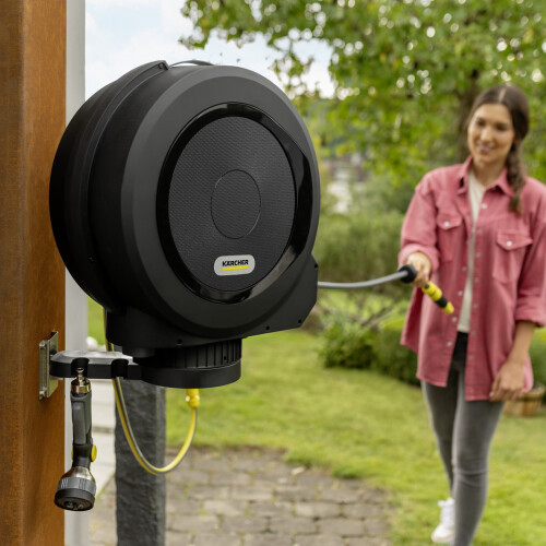 Vždy ideálně uložen: stylový box na hadici se montuje na stěnu, aby se ušetřilo místo, a připojuje se k vodovodnímu kohoutku pomocí připojovací hadice. Díky nástěnnému držáku lze box na hadici dokonce otočit o více než 180°, takže hadice snadno dosáhne do každého koutu zahrady. Zahradní hadici lze snadno prodloužit na maximální délku 25 metrů. K dispozici jsou odpovídající blokační stupně: hadice se v krátkých intervalech plně automaticky zaaretuje. Jemným zatažením za konec hadice se uvolní blokovací mechanismus, takže se hadice automaticky a kontrolovaně zasune, aniž by se zamotala nebo zauzlovala. Díky inovativnímu systému montáže FlexChange lze box s hadicí vyjmout z nástěnného držáku bez použití jakéhokoli nářadí. To je ideální pro snadné uložení v zimě nebo pro flexibilní použití mezi nástěnným držákem a hadicovým kolíkem, který je k dispozici jako volitelné příslušenství. Box na hadici je navíc odolný proti UV záření a mrazu, a proto jej lze na stěně domu ponechat po celý rok. K ochraně proti krádeži lze připojit kabelový zámek. Společnost Kärcher poskytuje na výrobek pětiletou záruku.