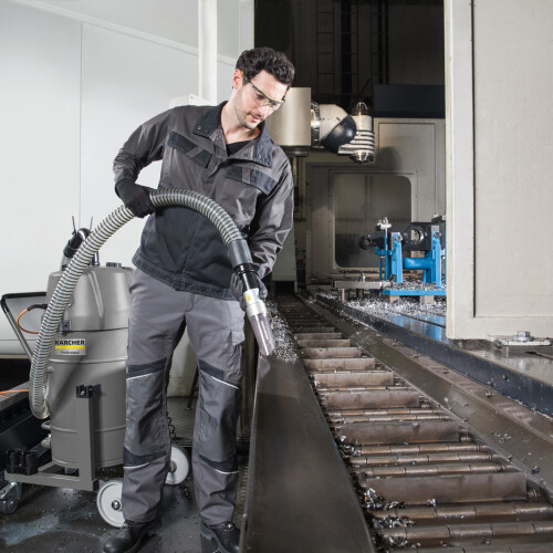 Průmyslový vysavač Kärcher IVR-L 65/12-1 Tc je vhodný k vysávání a oddělování chladicích a mazacích prostředků, vody nebo oleje s pevnými látkami (např. kovové špony). Vysáté špony mohou být nahromaděny v koši na špony, zatímco tekutina se přes vypouštěcí hadici uvádí zpět do oběhu. Volitelně lze vypuštění tekutiny provést přes sklopný podvozek. Aktuální stav naplnění je kdykoliv čitelný na vypouštěcí hadici. Vysávání probíhá prostřednictvím o 360° otočné přípojky hadice na sací hlavě. Nečistoty kolem vysávání lze tak pohodlně a bez zamotání hadice vysát. Integrované mechanické vypnutí stavu naplnění chrání vysavač před přeplněním. S výkonem motoru 1,2 kW je Kärcher IVR-L 65/12-1 Tc základním přístrojem v oblasti vysávání tekutin a/nebo špon.