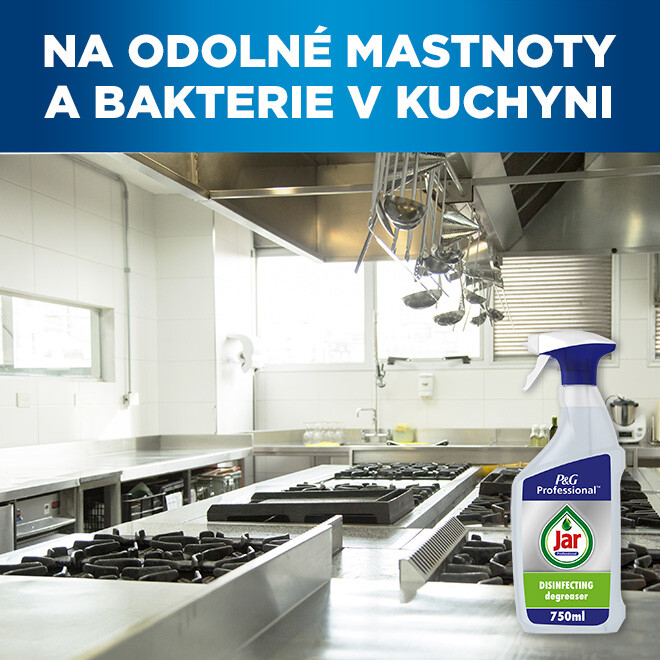 Víceúčelový čistič a dezinfekční prostředek JAR Disinfecting Degreaser spolehlivě odstraní mastnotu a zničí 99,99 % bakterií (včetně salmonely a listerie). Vhodný na pracovní desky, dřezy, sporáky, keramické obklady i další povrchy v kontaktu s potravinami. Bez parfemace.
