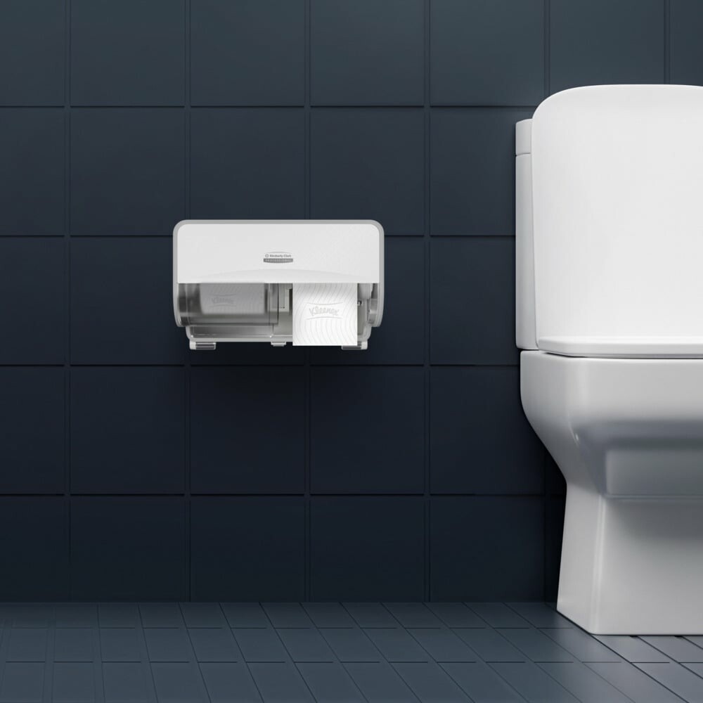 Toaletní papír Kleenex® je kompatibilní s dávkovači Aquarius™ Twin Roll v bílé i černé barvě (obj. č. 6992) a hodí se do většiny běžných zásobníků na roličkové toaletní papíry.