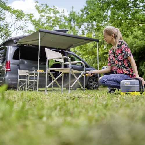 Skladná mobilní tlaková myčka OC 3 Plus Car vám poslouží při kempingu, cyklistice i procházkách s domácím mazlíčkem. Pohání ji výkonná li-on baterie - LED kontrolka průběžně signalizuje stav nabití. Díky nízké hmotnosti a pevnému držadlu se myčka také snadno přenáší. Nízkotlaká tryska šetrně, ale efektivně vyčistí nánosy špíny z turistické obuvi i jízdních kol. Odnímatelná sedmilitrová nádrž pak zajistí dostatek vody i bez vodovodní přípojky. Pod ni snadno uložíte tlakovou pistoli i 2,8m dlouhou spirálovou hadici, takže vám přístroj nezabere příliš místa. Na cestách oceníte také praktický adaptér do auta. Díky němu můžete myčku napájet i z vaší autobaterie (neslouží ovšem k nabíjení). K myčce je možné přikoupit také speciální kartáč či box s dalším příslušenstvím, díky kterému se dokonale přizpůsobí každému vašemu dobrodružství.