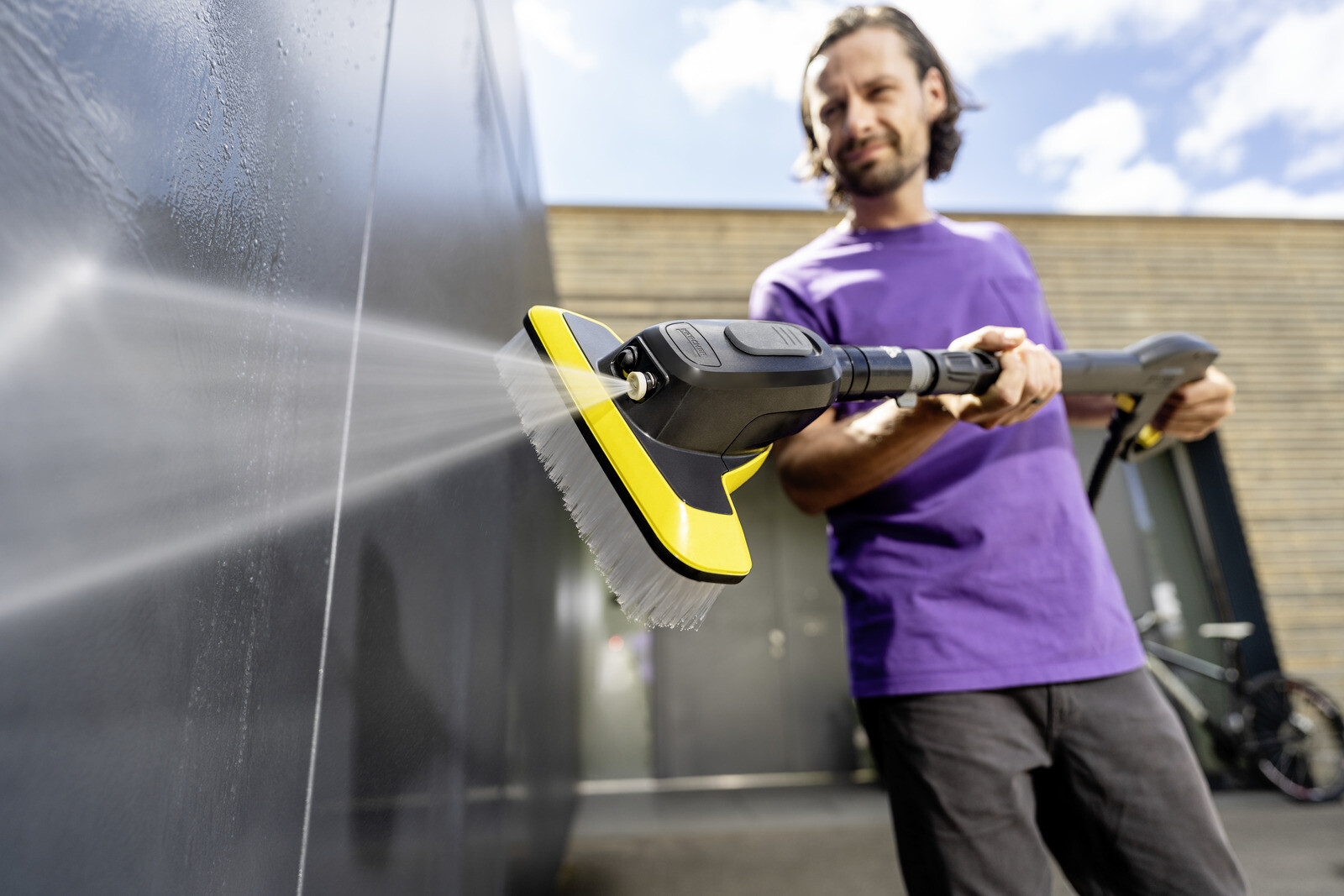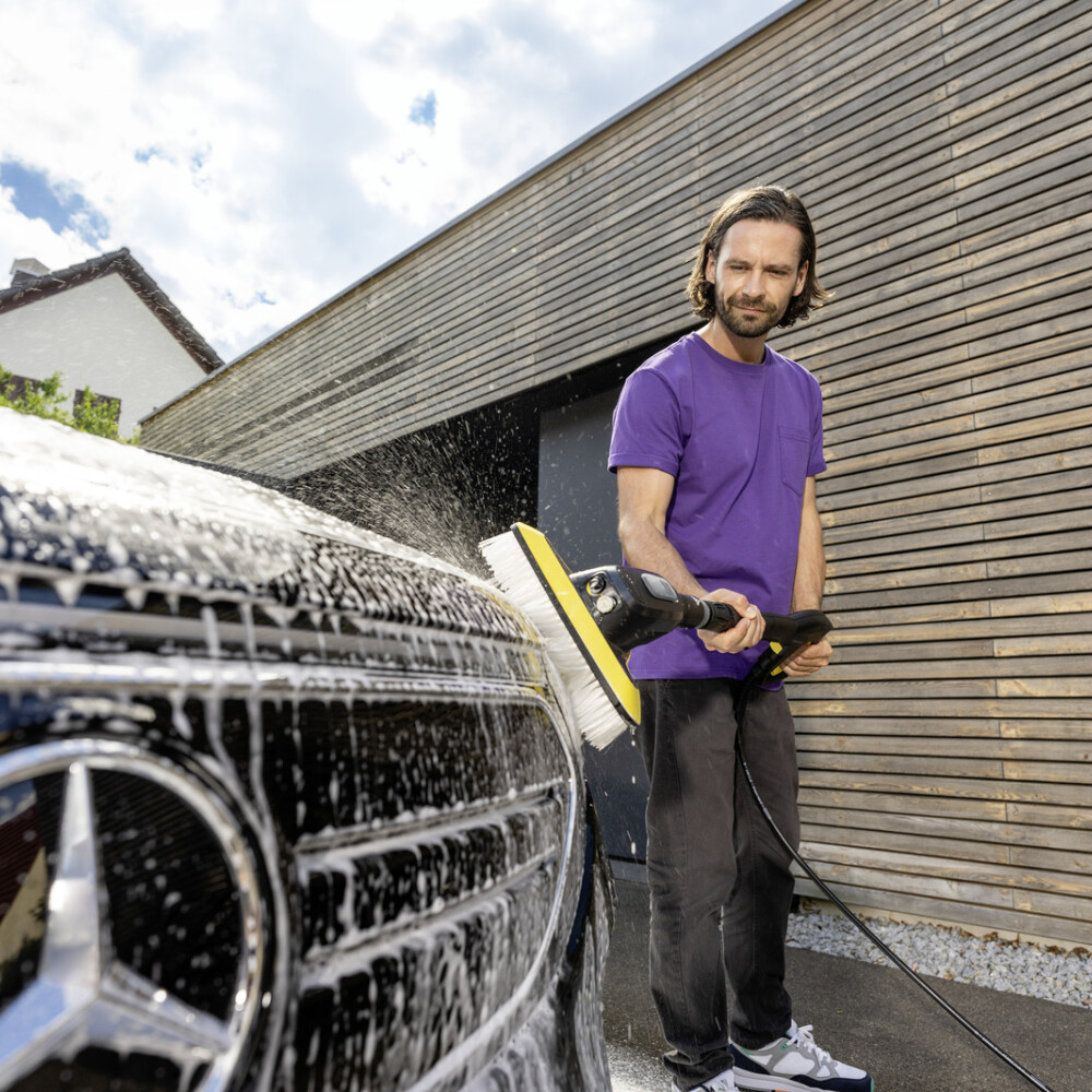 Chytře nakombinováno: Mycí kartáč WB 7 Plus 3 v 1 spojuje tři důležité funkce v jediném produktu. Nanášejte pěnu, uvolněte odolnou špínu vysokotlakým plochým sprejem nebo pracujte obzvlášť důkladně a opatrně měkkým štětcem – vše je možné, aniž byste museli příslušenství byť jen jednou vyměňovat. Požadovaná funkce se volí páčkou v oblasti úchopu kartáče. To znamená, že mycí kartáč je obzvláště univerzální, šetří čas, je pohodlný a vždy zaručuje dokonalé výsledky čištění – dokonce i na choulostivých površích, jako je barva, sklo nebo plast. Integrovaná nádrž na čisticí prostředek umožňuje uživatelům pracovat déle bez doplňování.