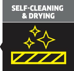 | Vlastní údržba pomocí multifunkční stanice | Jakmile je úklid dokončen, robot RVM 4 Comfort se vrátí do multifunkční stanice, kde automaticky vyprázdní nádobu na prach a vyperou a vysuší mikrovláknové utěrky.. Stírací jednotka se rychleji suší horkým vzduchem, aby se zabránilo vzniku zápachu.. Zpráva se zobrazí, pokud je nádrž na čistou vodu prázdná nebo není nainstalována, nádrž na špinavou vodu je plná nebo není nainstalována, nebo není nainstalován filtrační sáček. |
