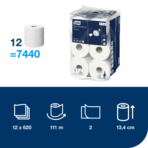 Tork SmartOne mini toaletní papír v roli je jedinečný systém, který nabízí pokaždé jeden hygienický útržek a v porovnání s tradičními zásobníky na jumbo role snižuje spotřebu až o 40 %. Každá role tak vystačí pro více návštěvníků. Tork SmartOne mini role s vysokou kapacitou jsou vhodné do náročných podmínek toalet a umýváren bez ohledu na jejich návštěvnost. Stačí si zvolit vhodný Tork SmartOne mini zásobník.