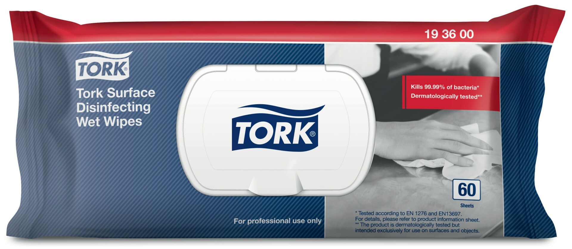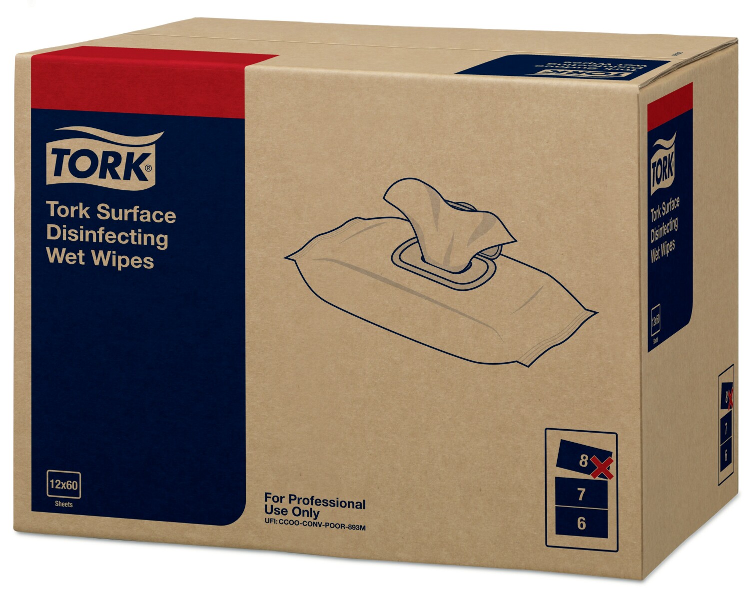 Tork vlhčené utěrky na dezinfekci povrchů představují dezinfekční prostředek připravený k použití, který účinkuje proti širokému spektru bakterií, kvasinek a virů včetně koronaviru. Jsou dermatologicky testované a vhodné na tvrdé neporézní povrchy a předměty. Prodávají se v balení flowpack po 60 utěrkách se znovu uzavíratelným víčkem, které pomáhá chránit vlhkost utěrek.