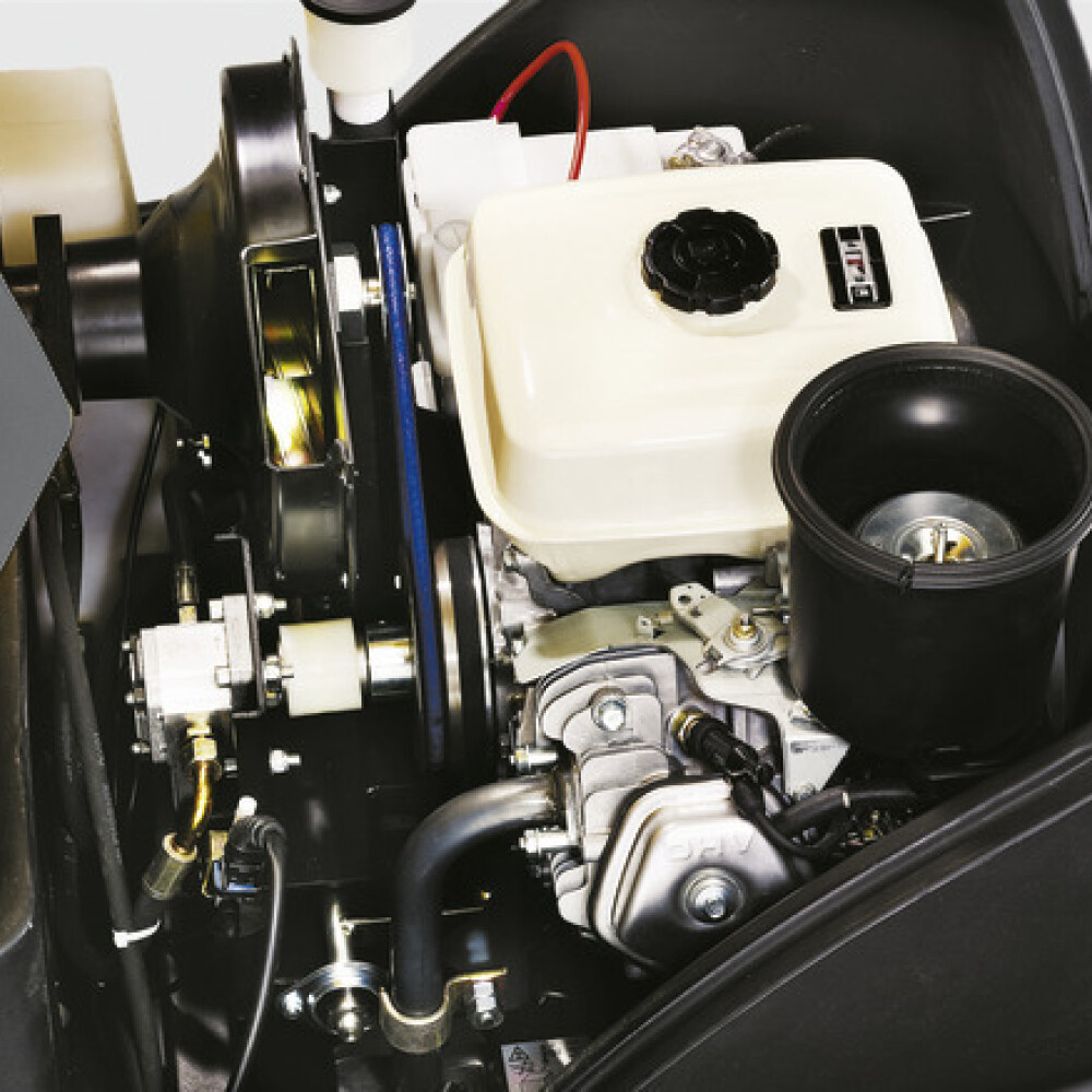 TECHNICKÝ POPIS : Pohon: - Motor Honda 6,7 kW - 1 pedál pro jízdu dopředu a dozadu - Malý poloměr otáčení (3350 mm) - Automatická parkovací brzda s technologií podtlaku - Automatické vypínání motoru při opuštění sedadla Systém zametání/sání: Stroj pracuje na principu přehazování přes hlavu, tzn. zametené nečistoty jsou dopravovány zametacím válcem dozadu do zásobníku na zametené nečistoty. Zametací válec je výkyvně zavěšen a automaticky se přizpůsobí nerovnostem podlahy. Jak filtr tak i hlavní zametací válec lze vyměnit bez použití nářadí. Vestavěná klapka hrubých nečistot pojme hrubé nečistoty, jako plechovky od nápojů, střepy, štěrk nebo mokré listí. Postranní kartáč a hlavní zametací válec jsou poháněny hydraulicky. Volitelně je k dispozici i druhý postranní kartáč. Zásobník na zametené nečistoty: Oba zásobníky na zametené nečistoty á 50 litrů jsou po stranách vyjímatelné. Obsluha: Postranní kartáč a hlavní zametací válec lze spustit pomocí přepínače. Jízdu dopředu a dozadu upravuje jediný jízdní pedál.