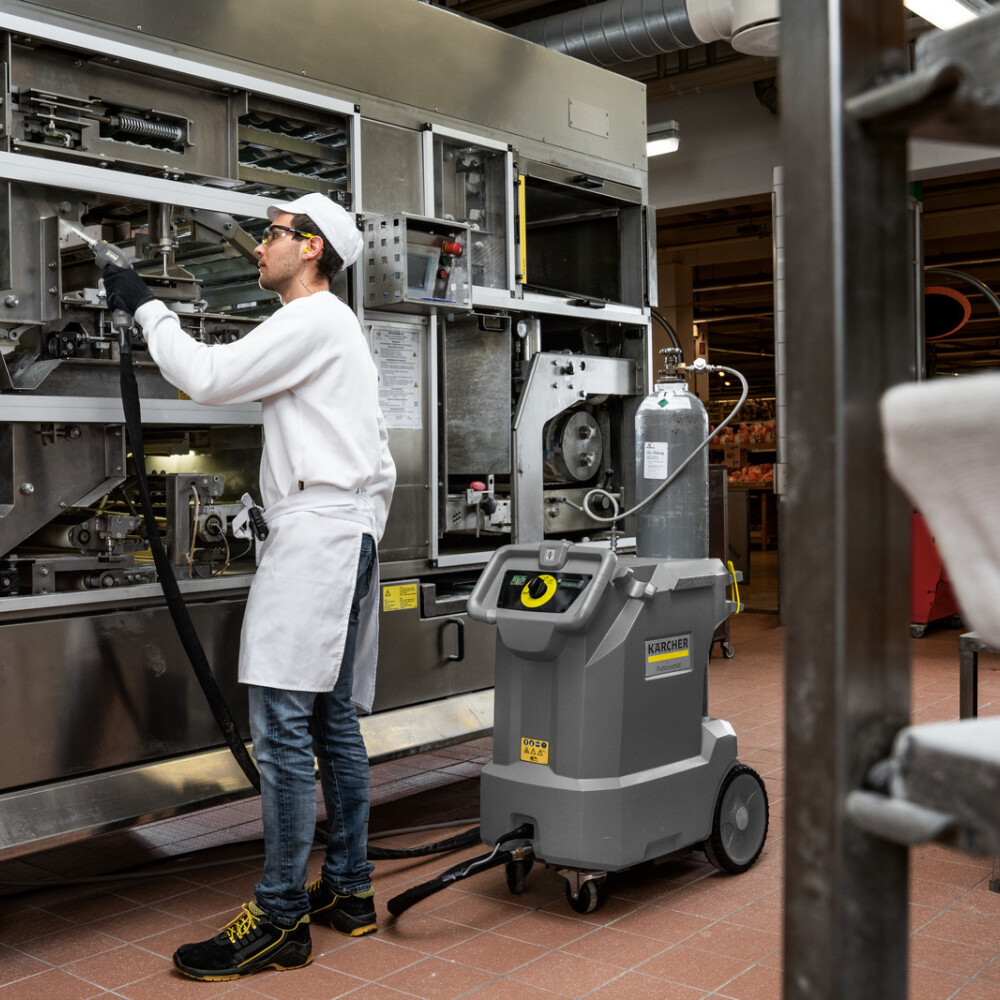 Spontánní čisticí práce se zařízením na tryskání suchého ledu při údržbě strojů nebo vozidel, při čištění ve výrobním procesu nebo při úpravě vozidla byly až dosud nemyslitelné, protože logistika suchého ledu byla pro krátkodobé aplikace příliš nákladná. To je nyní možné u IB 10/8 L2P, prvního zařízení na tryskání suchéým ledem na světě s integrovanou výrobou suchého ledu z kapalného CO₂. Díky inovativnímu postupu se pelety suchého ledu vyrábějí v případě potřeby z kapalného CO₂ - L2P znamená „Liquid-to-Pellet“. Protože kapalný CO lze skladovat v plynových lahvích prakticky neomezeně dlouho, je zabráněno obvyklé časově náročné logistice suchého ledu. Velmi nízká spotřeba stlačeného vzduchu stroje také významně snižuje požadavky na infrastrukturu. Zároveň jsou plně zachovány výhody technologie suchého ledu Kärcher. IB 10/8 L2P čistí velmi šetrně - také na složité kontury, jako jsou drážky, ložiska nebo drážky, a to i v případě silného znečištění. Spolehlivě se vyhnete zbytkům abraziva.